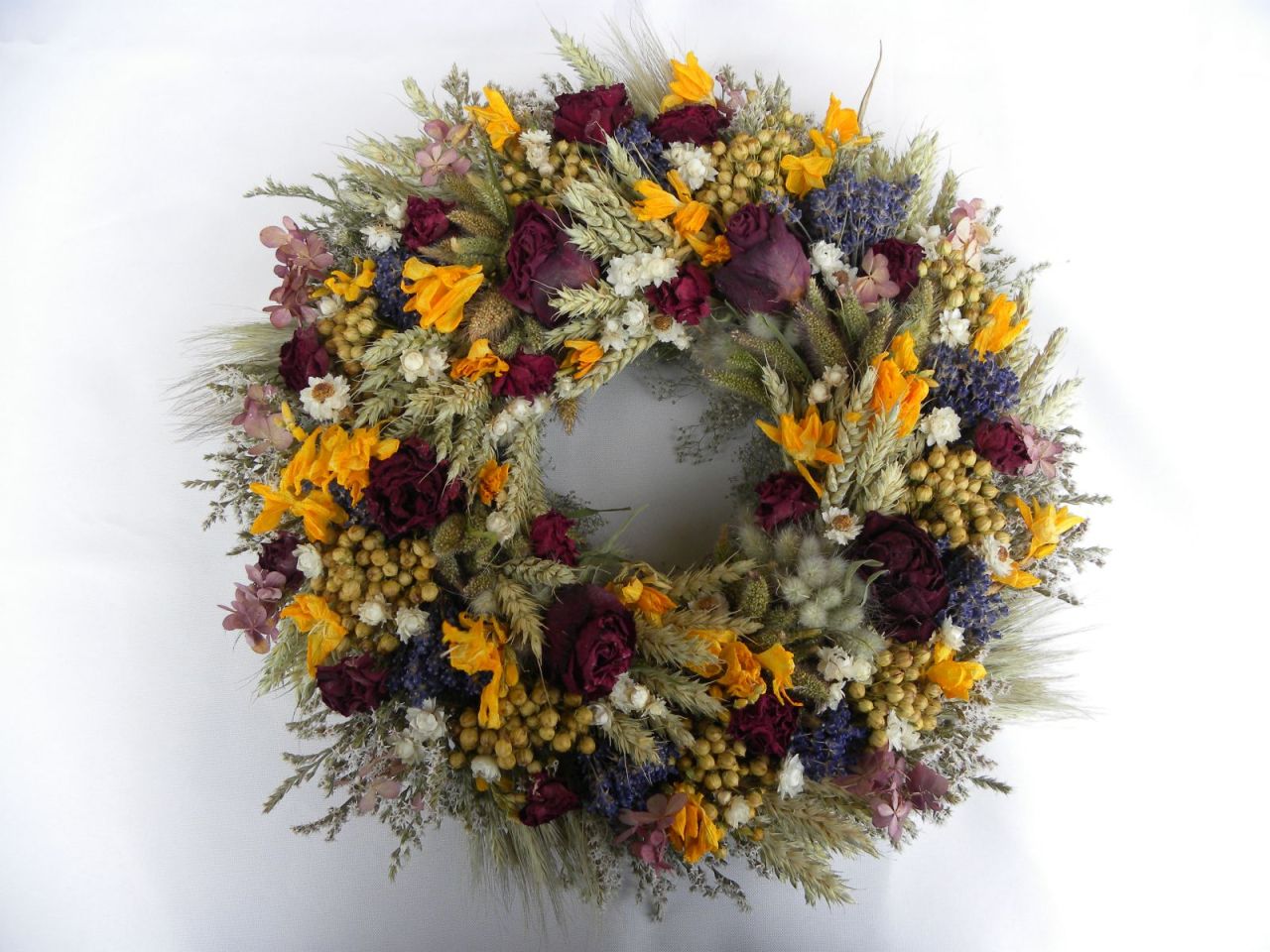 | luxusní velký věnec z přírodní sušiny a krásných sušených růží, průměr cca 42 cm, začištěný slámový základ, očko vzadu 698.00 Kč