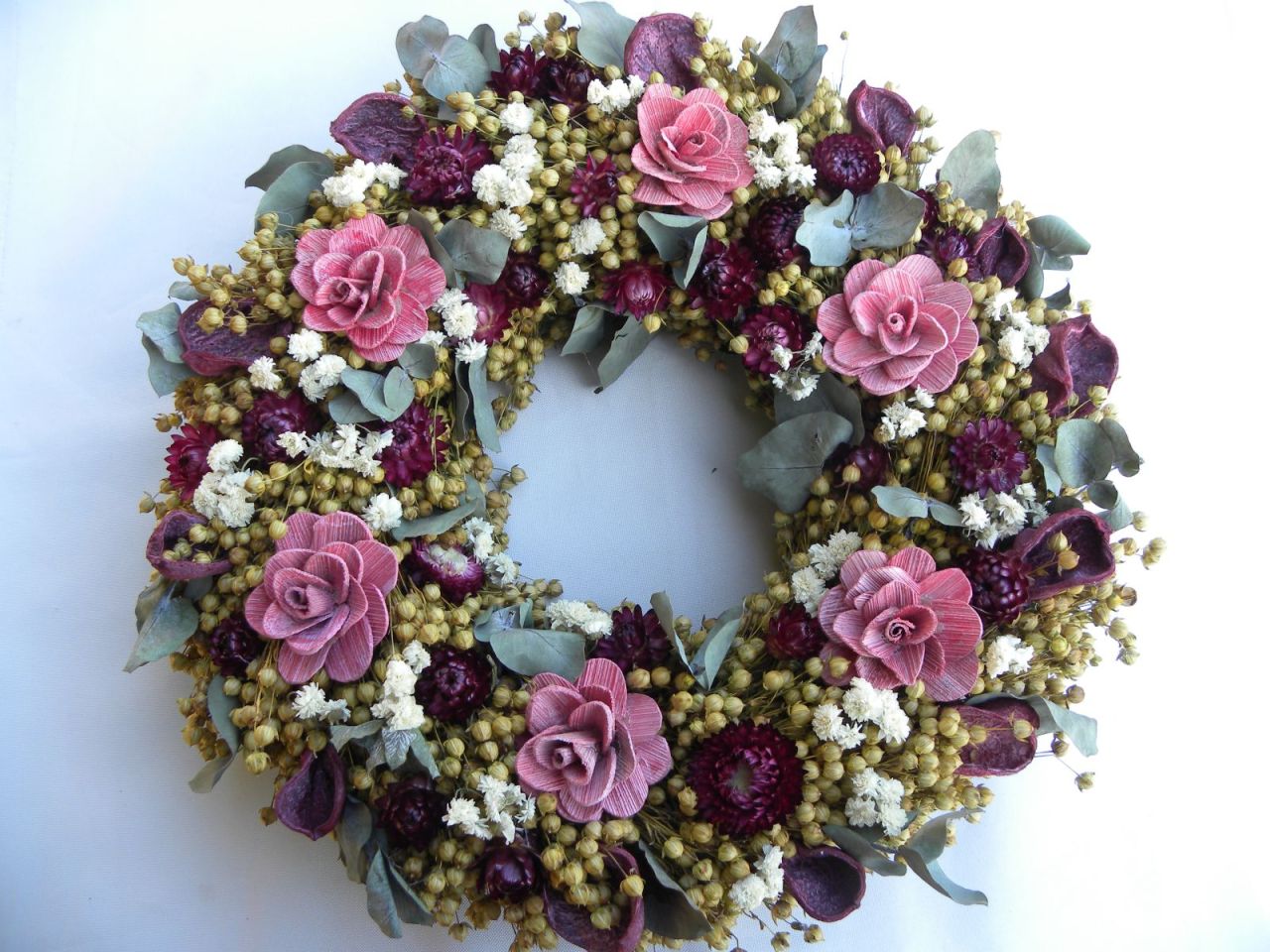 | bohatý věnec z přírodního lnu, dřevěných a sušených kvítků a listů eukalyptu, průměr cca 42 cm, očko vzadu 529.00 Kč
