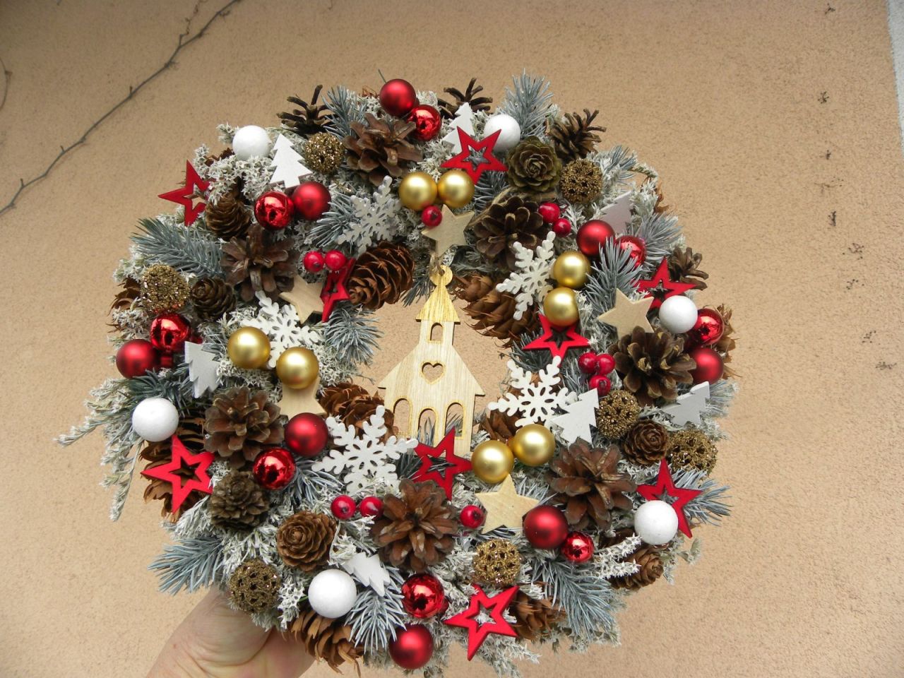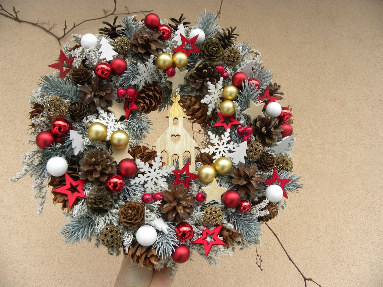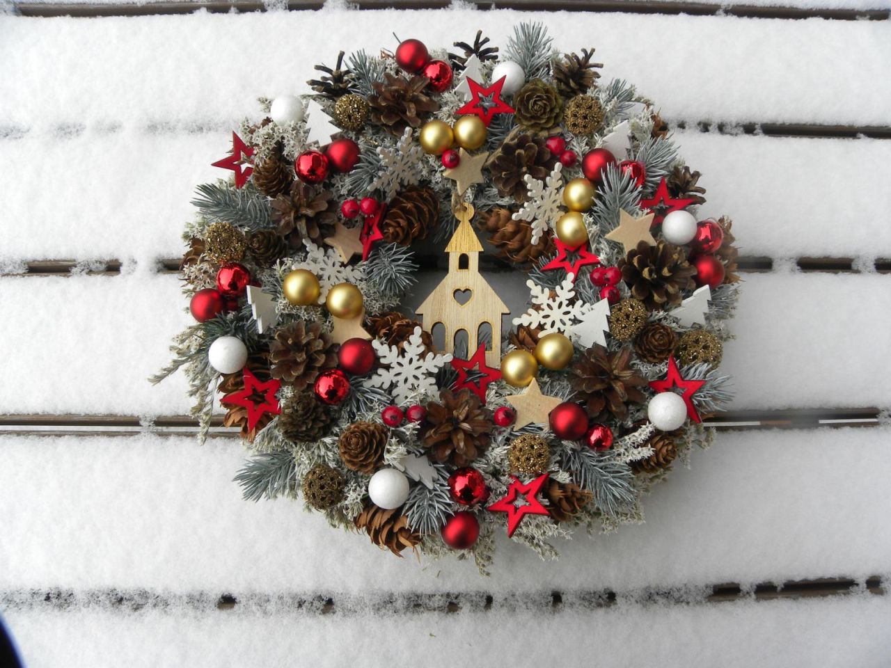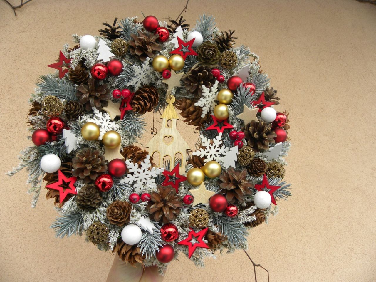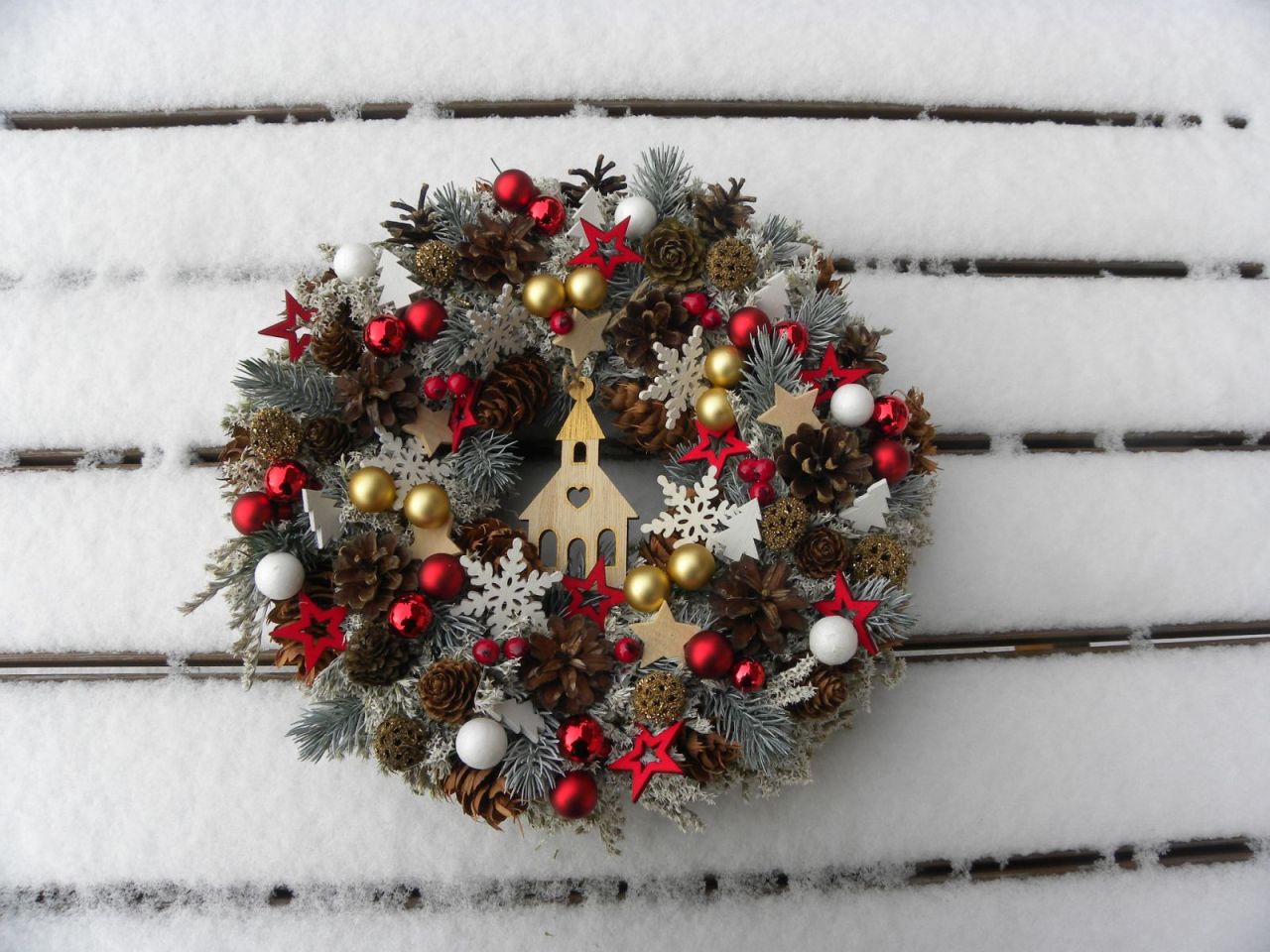 | bohatý trvanlivý věneček, sušinový základ přizdobený přírodninami, floristickými doplňky a skleněnými ozdobami, průměr cca 33 cm, začištěný slámový základ, vzadu očko na pověšení 649.00 Kč