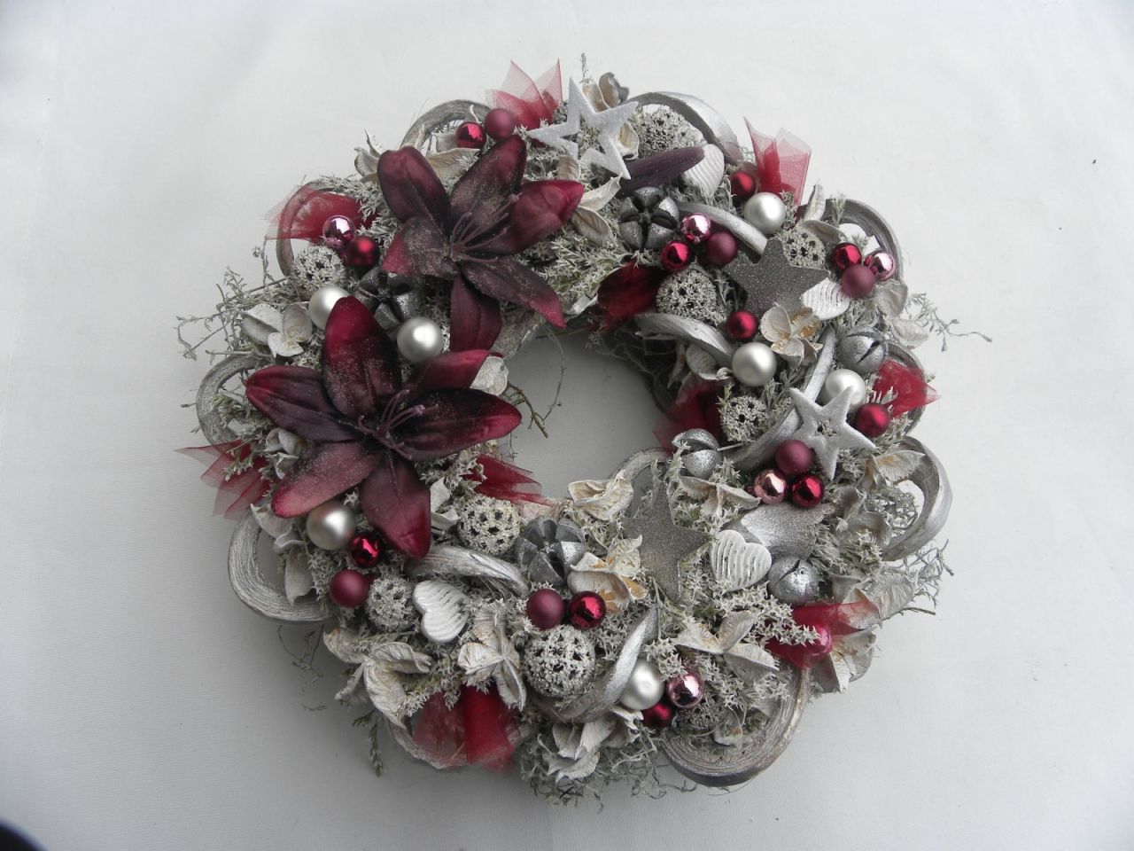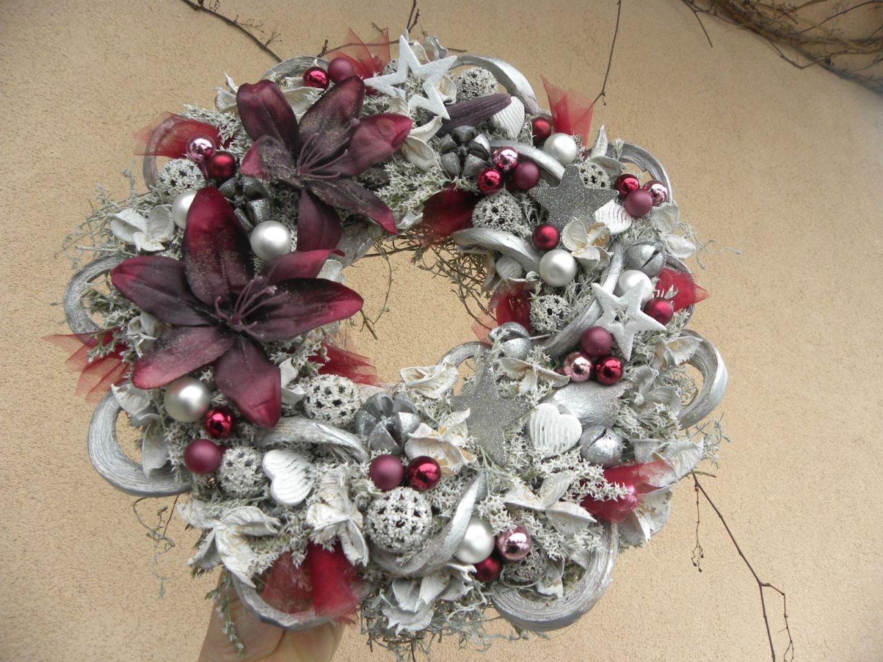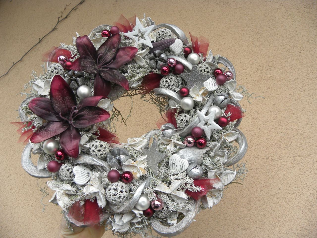 | originální přírodní věneček přizdobený luxusní květinou a skleněnými kouličkami, laděný do vínových odstínů, bohatý, objemný, naducaný, průměr cca 35 cm, slámový základ začištěný stuhou, vzadu očko na pověšení 598.00 Kč