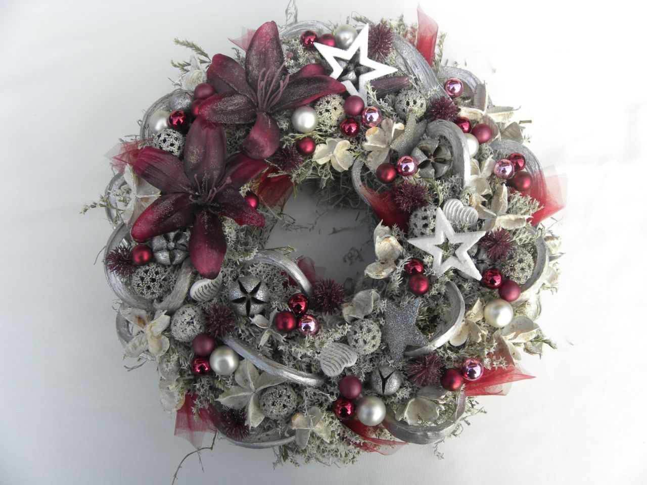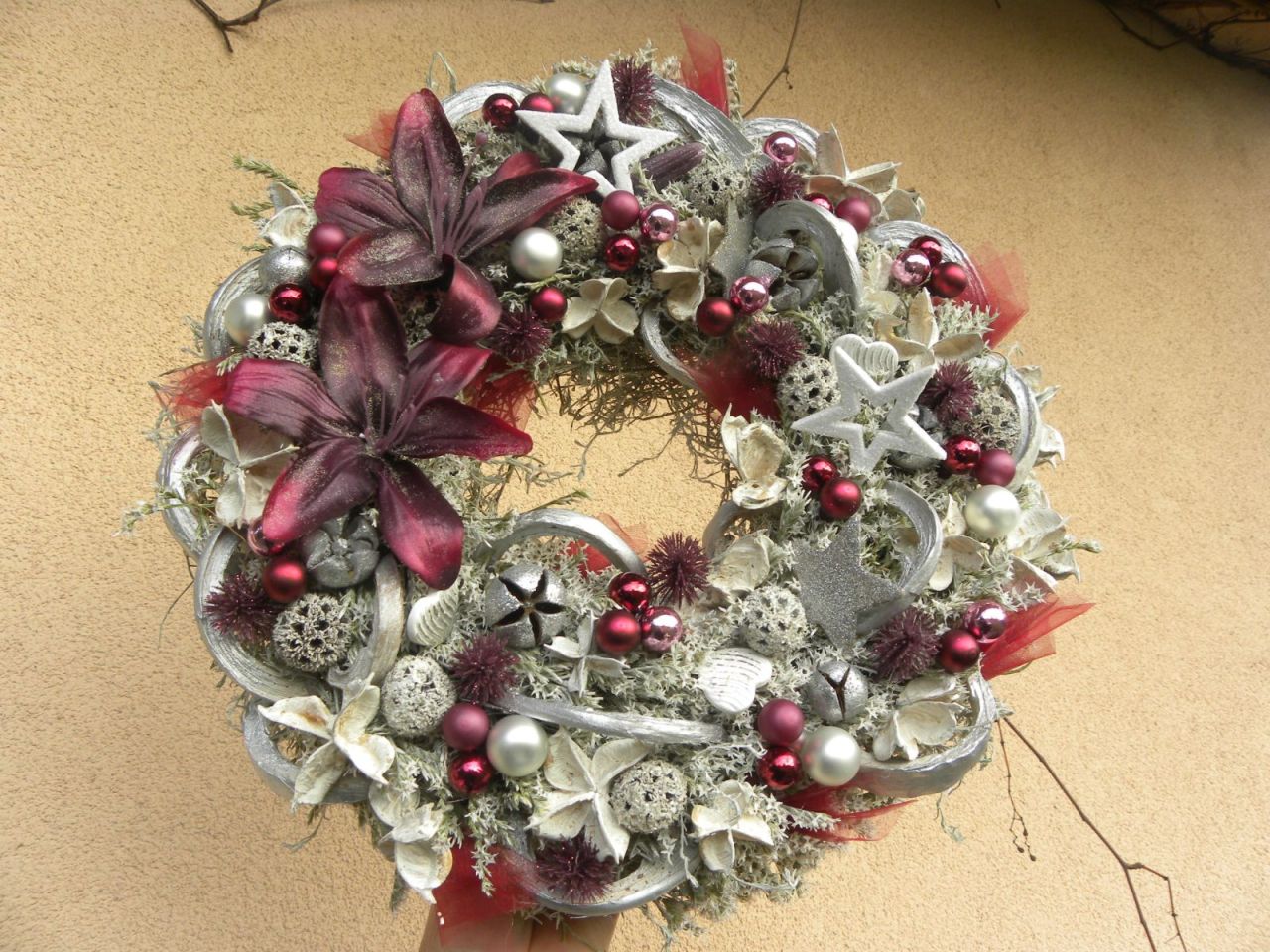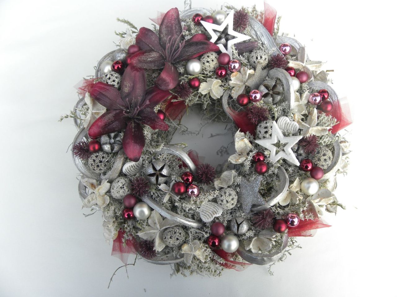 | originální přírodní věneček přizdobený luxusní květinou a skleněnými kouličkami, laděný do vínových odstínů, bohatý, objemný, naducaný, průměr cca 35 cm, slámový základ začištěný stuhou, vzadu očko na pověšení 598.00 Kč