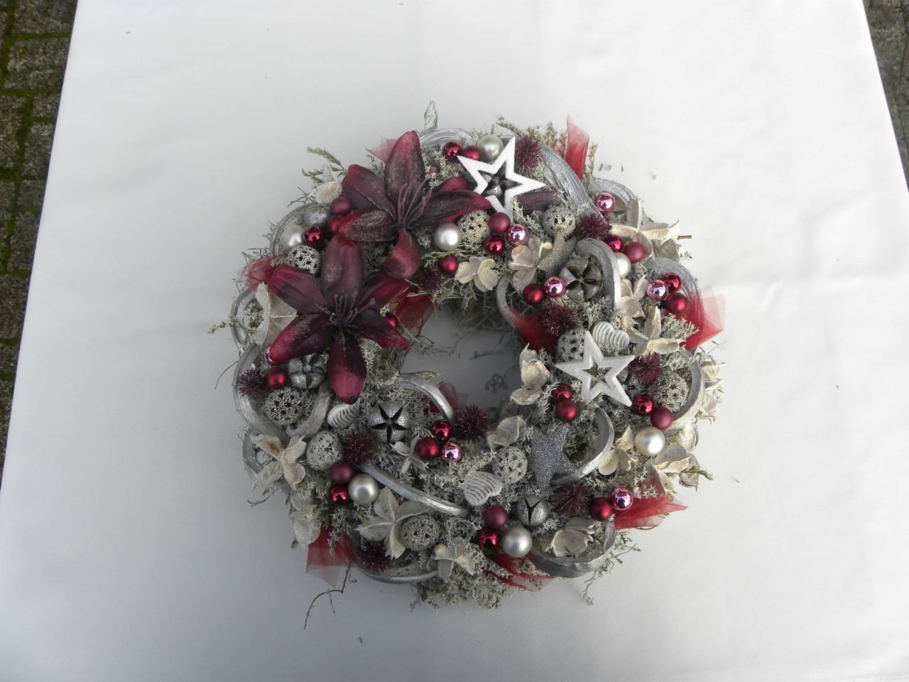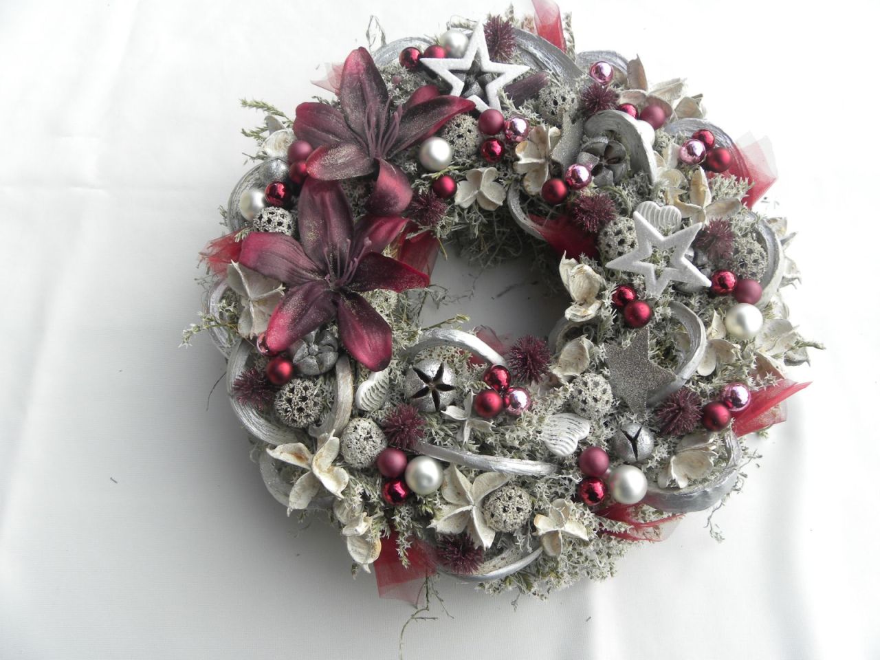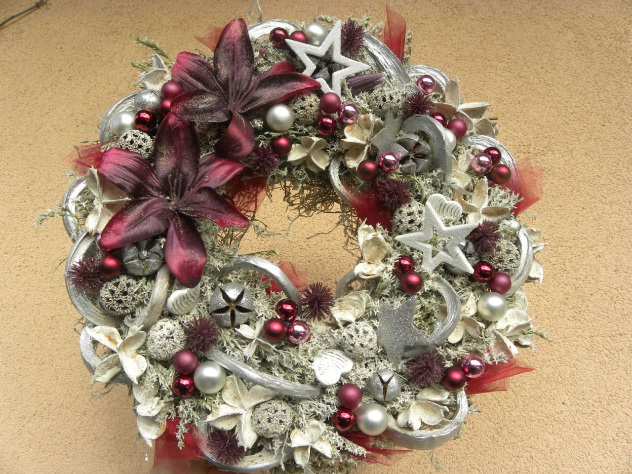 | originální přírodní věneček přizdobený luxusní květinou a skleněnými kouličkami, laděný do vínových odstínů, bohatý, objemný, naducaný, průměr cca 35 cm, slámový základ začištěný stuhou, vzadu očko na pověšení 598.00 Kč