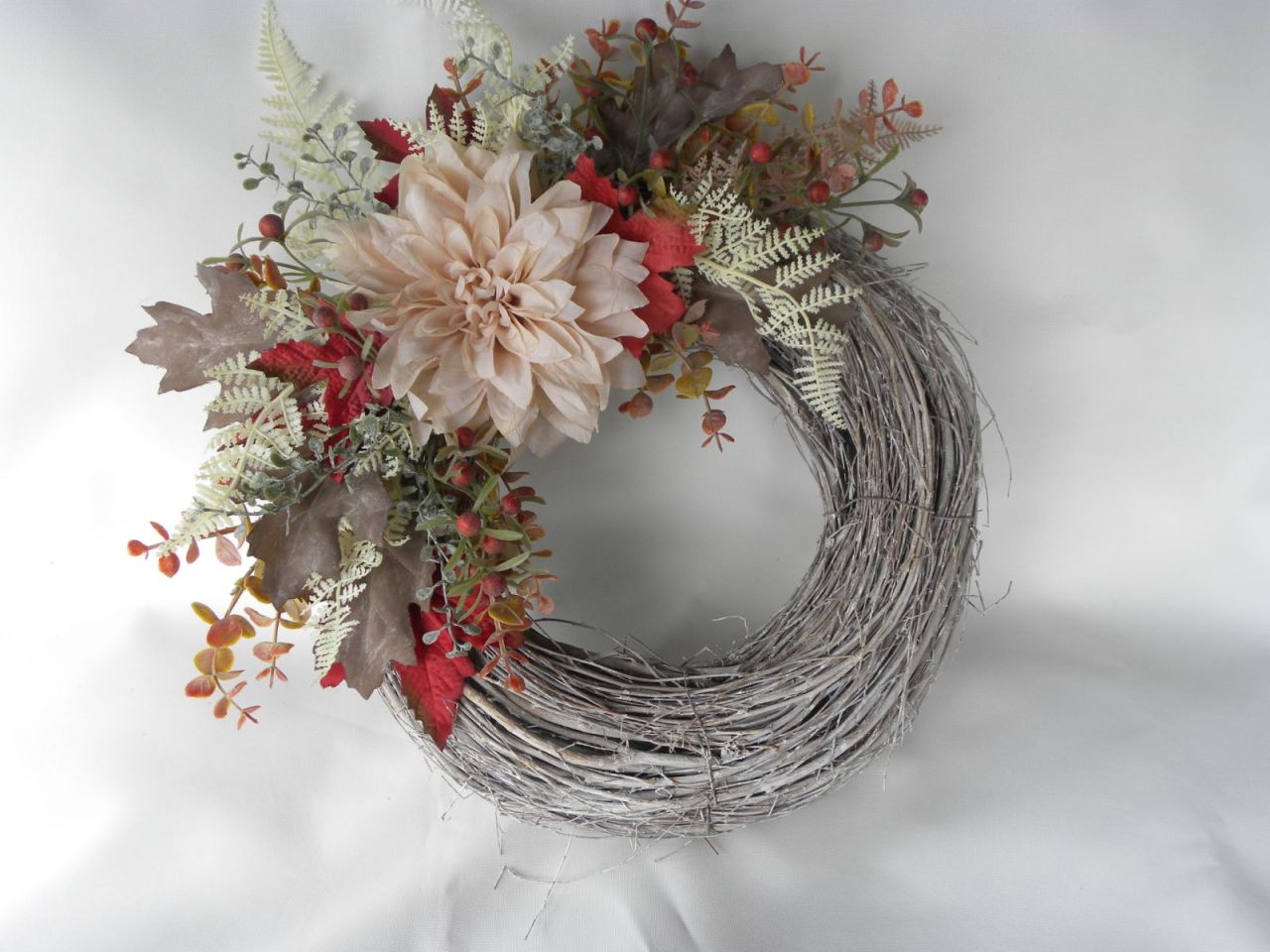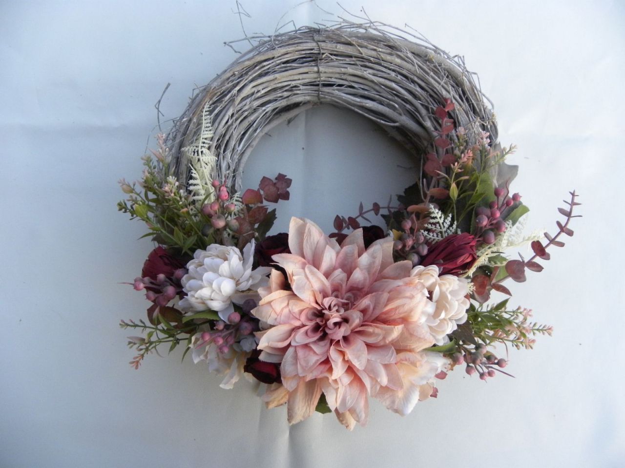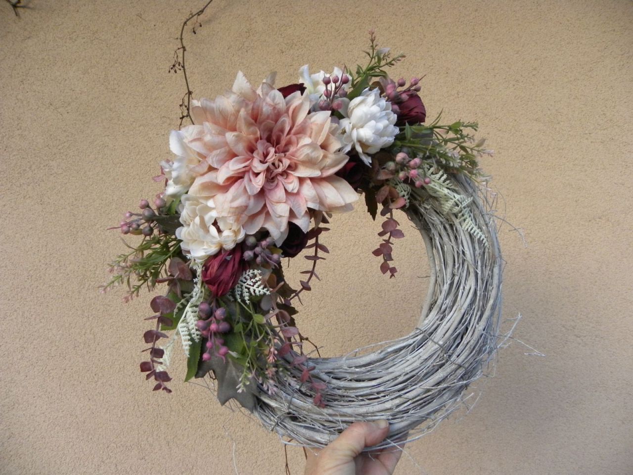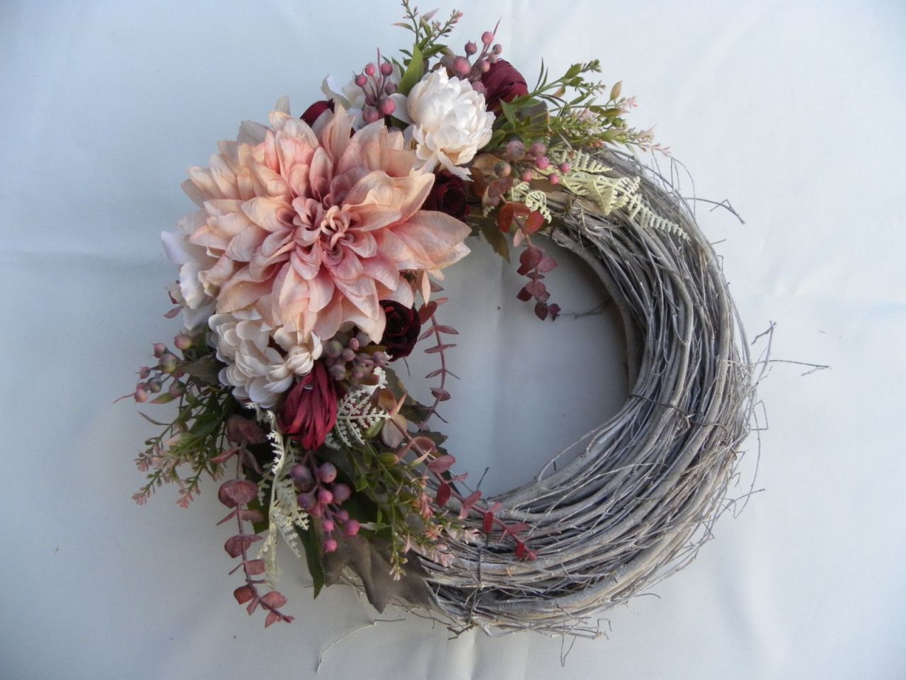 | proutěný věnec s patinou o průměru 30cm, dozdoben krásnými látkovými květy a trvanlivými floristickými materiály, velikost v nejširším místě cca 40 cm, trvanlivá dekorace 679.00 Kč