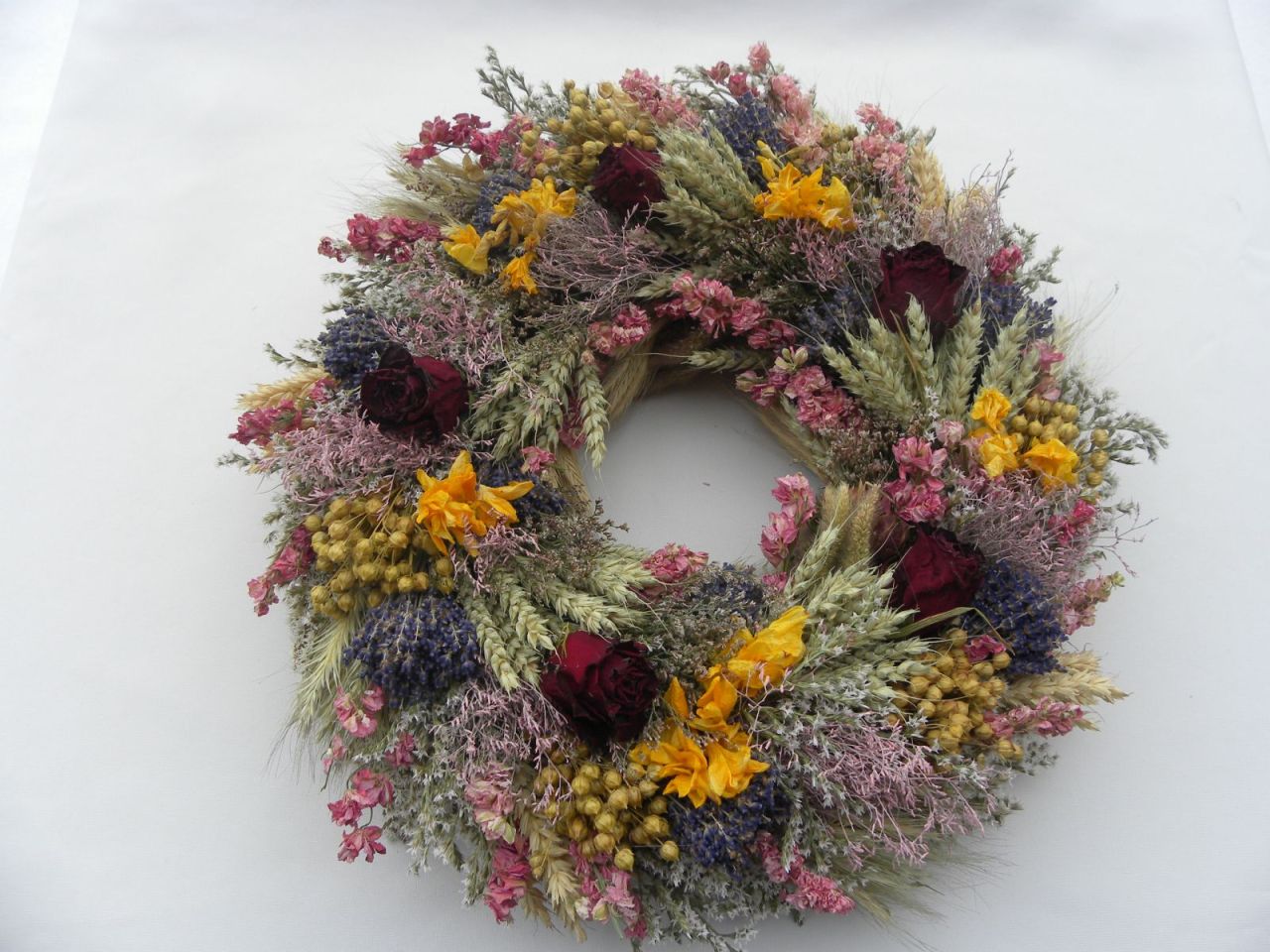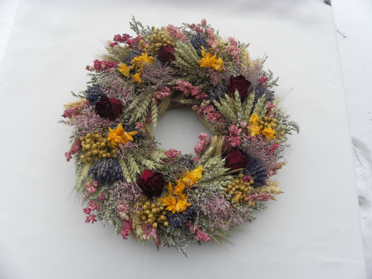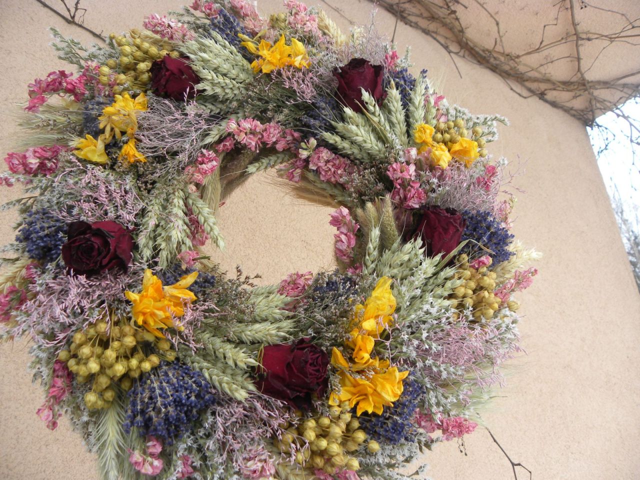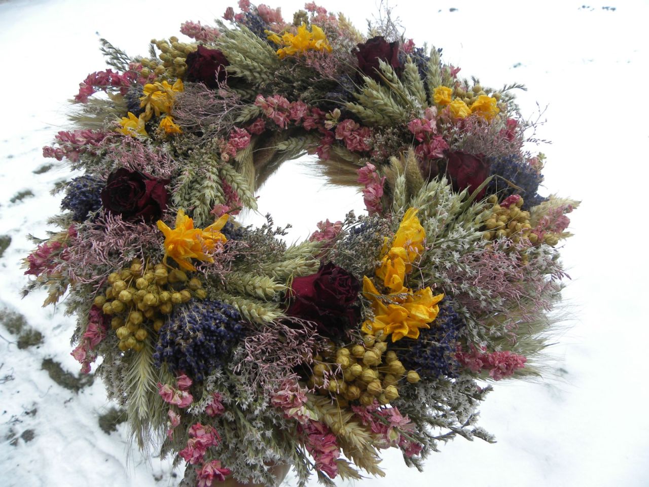 | velký bohatý čistě přírodní věnec ze sušiny, obilí, růží, průměr cca 43 cm, očko vzadu 845.00 Kč