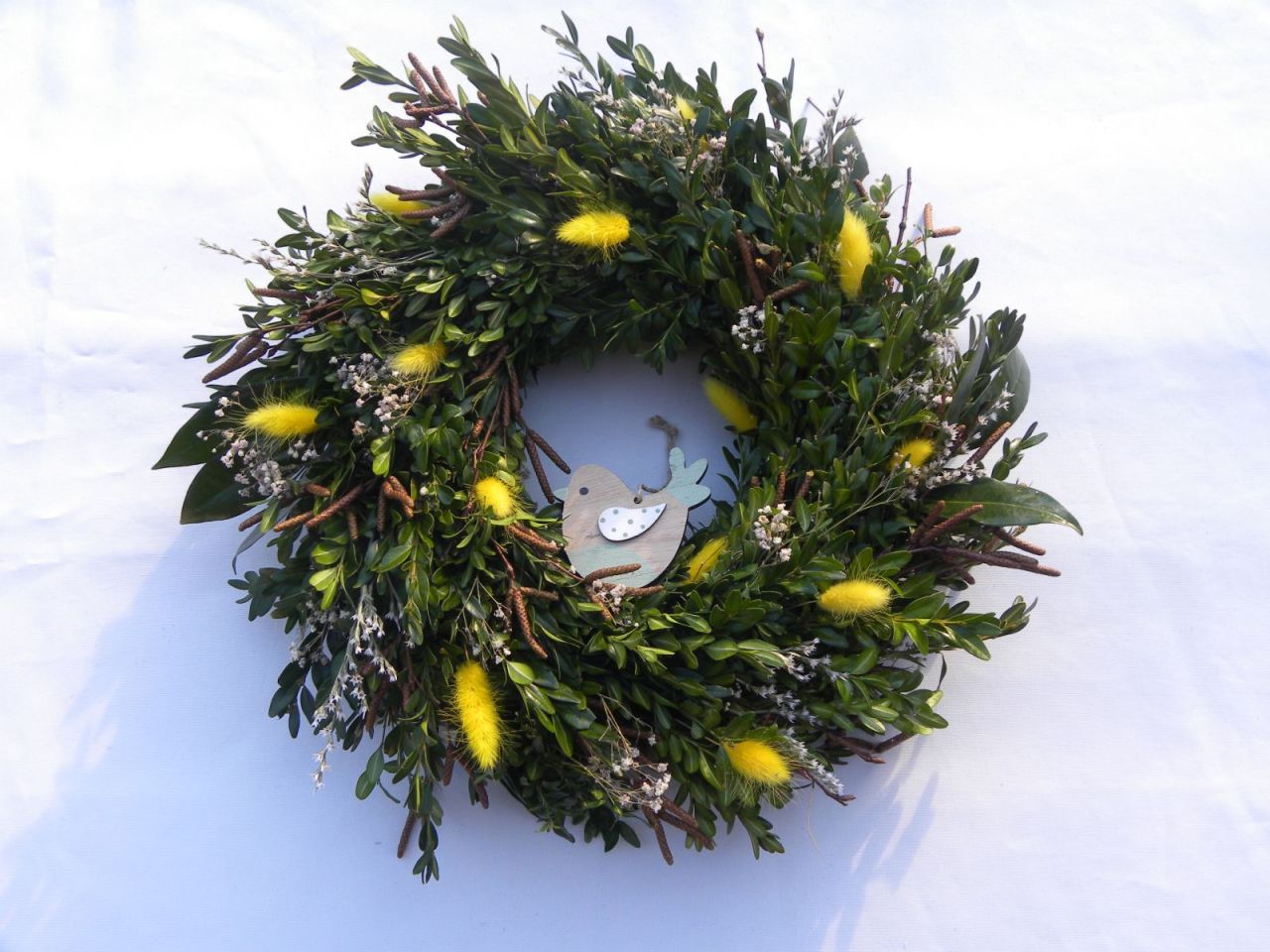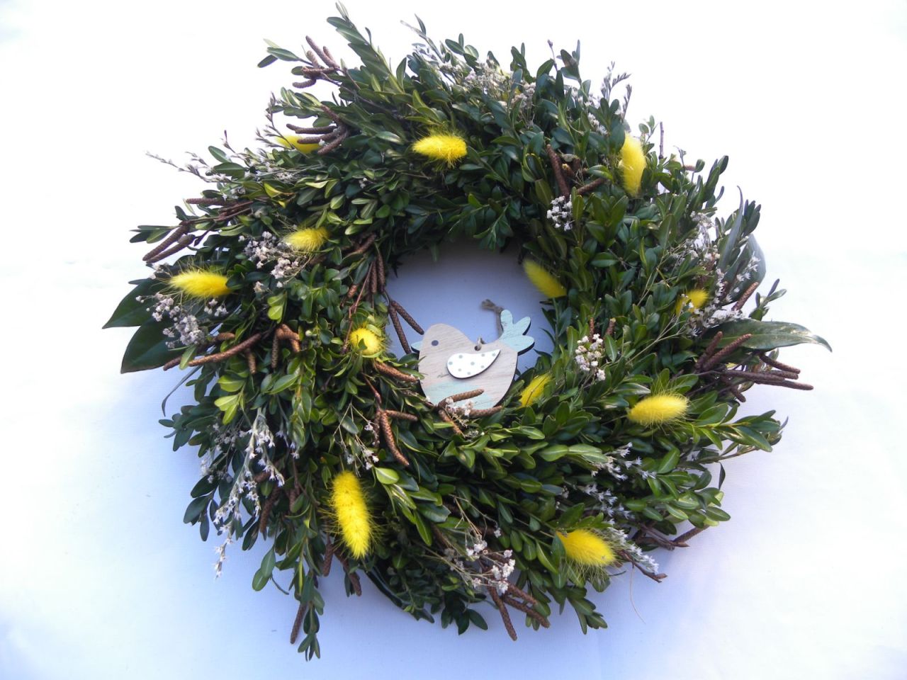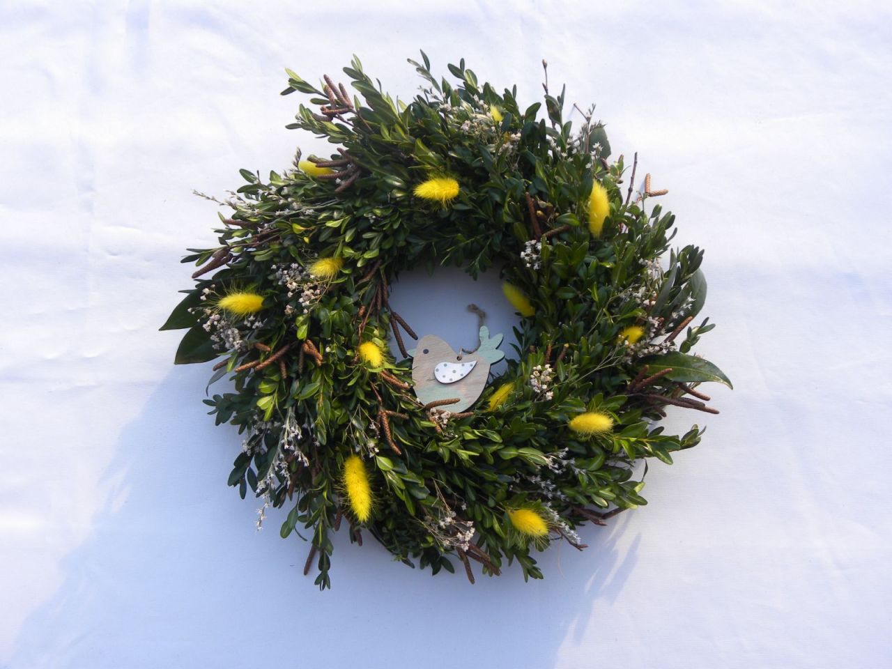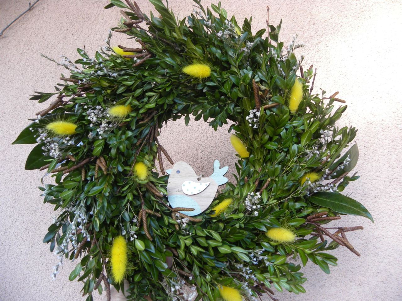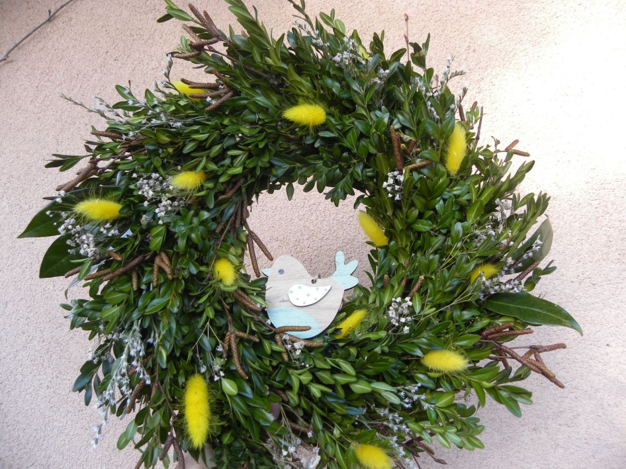 | Rustikální věnec na slámovém základu, vázaný z buxusu, doplněný březovými proutky, dřevěným ptáčkem .. na začištěném základu, očko na pověšení, ... průměr cca 36 cm 449.00 Kč