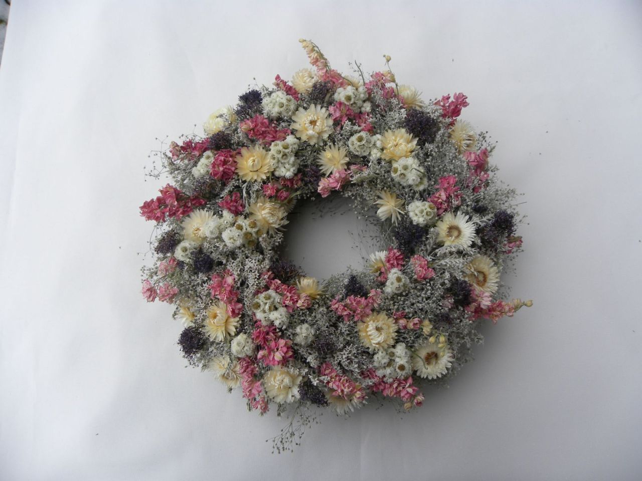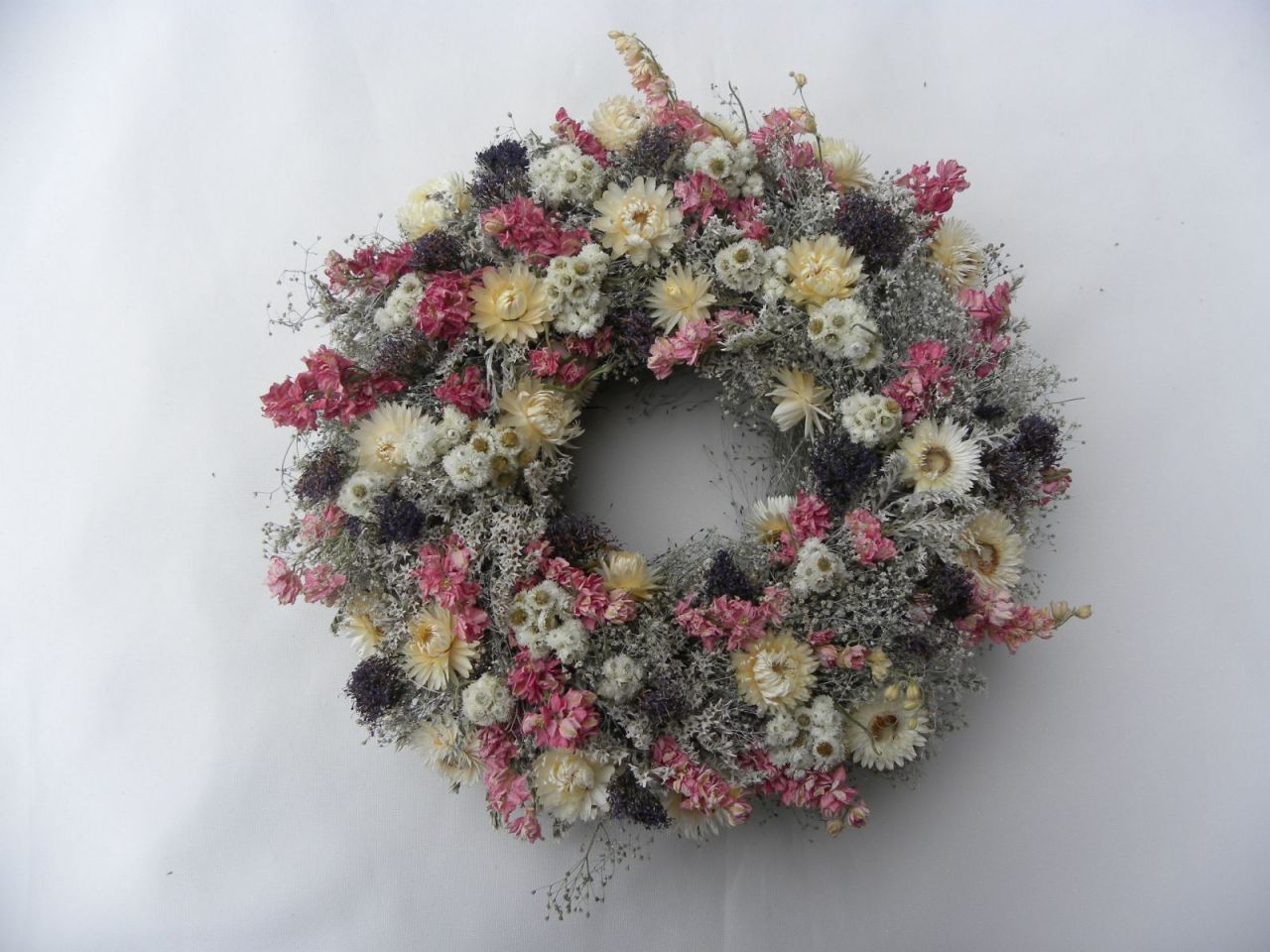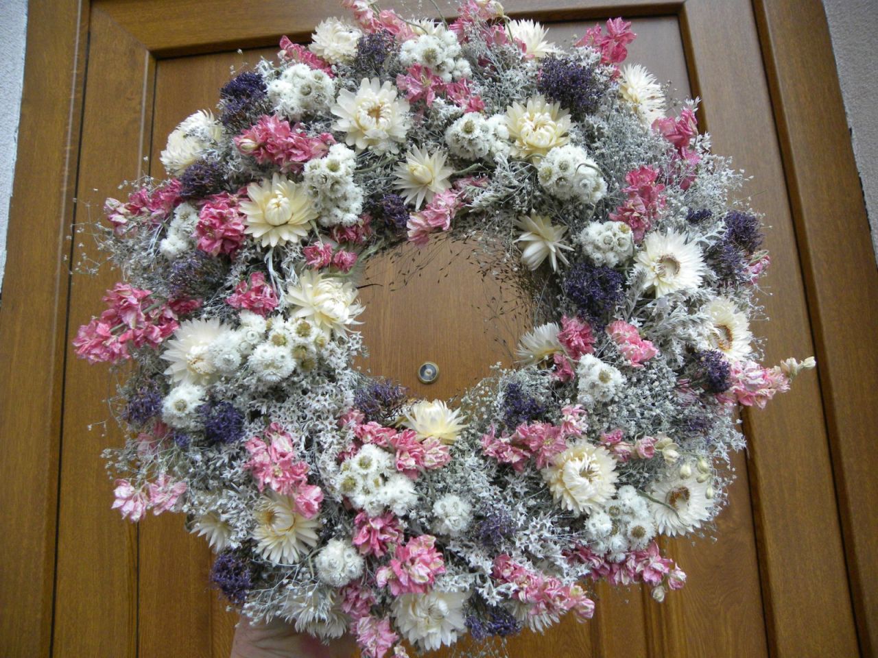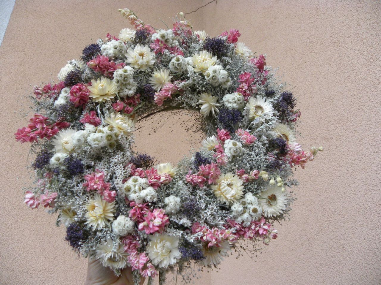 | přírodní věneček v jemných barvách o průměru cca 31 cm, krásně usušené nepřibarvované kytky, slámový základ je začištěný stuhou, očko na pověšení, 598.00 Kč